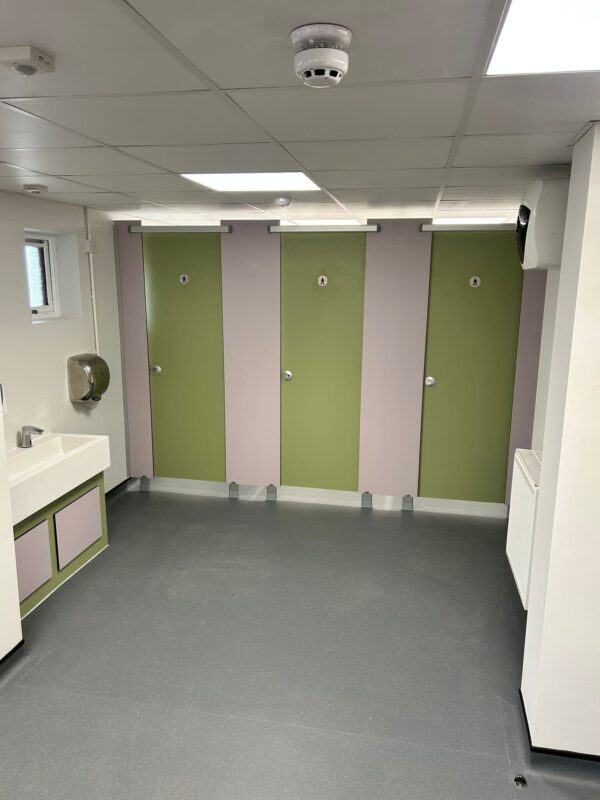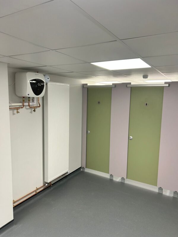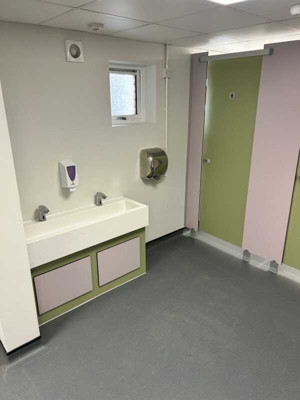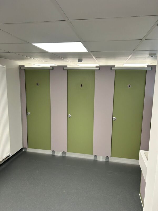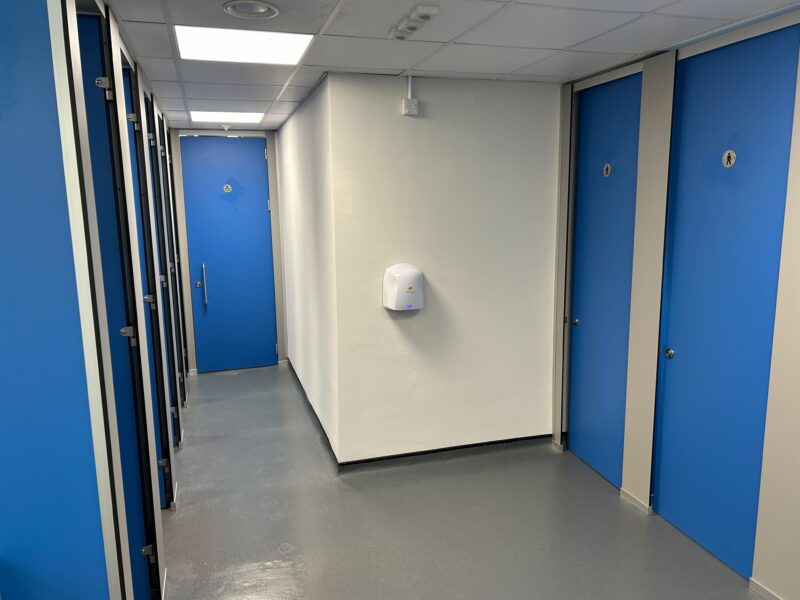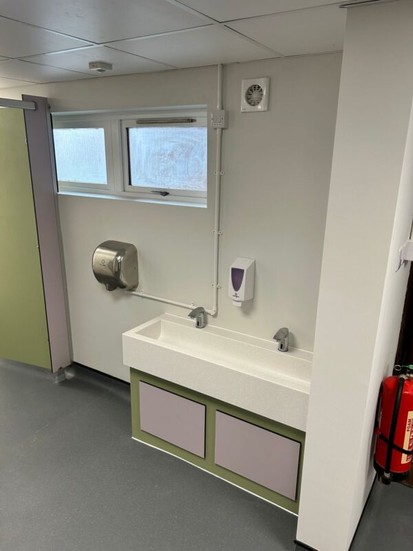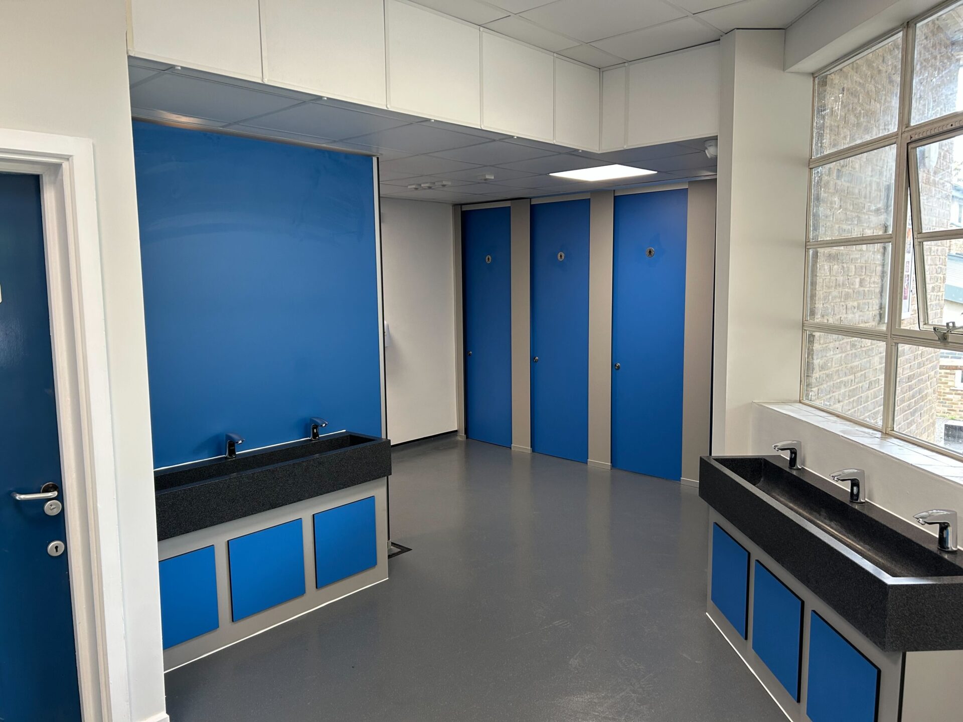 Washrooms were modernised with full-height cubicles, IPS panels to conceal pipework, and new sanitaryware, including dual-flush toilets, sinks, and taps. Sensor and time-flow options were included to reduce water consumption. Walls and ceilings were finished with hard-wearing, wipeable paint to ensure durability in a busy school environment.